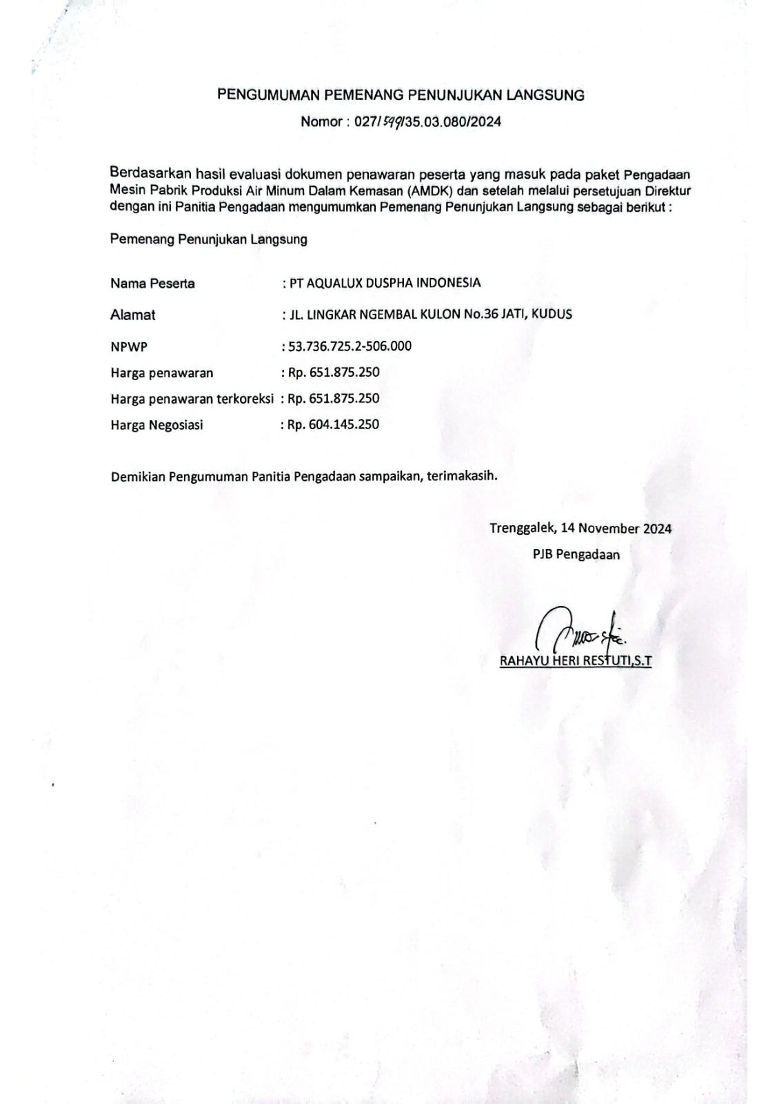Pengumuman Pemenang Penunjukan Langsung Pengadaan Mesin Pabrik Produksi Air Minum Dalam Kemasan (AMDK) Post published:15/11/2024 Post category:Uncategorized